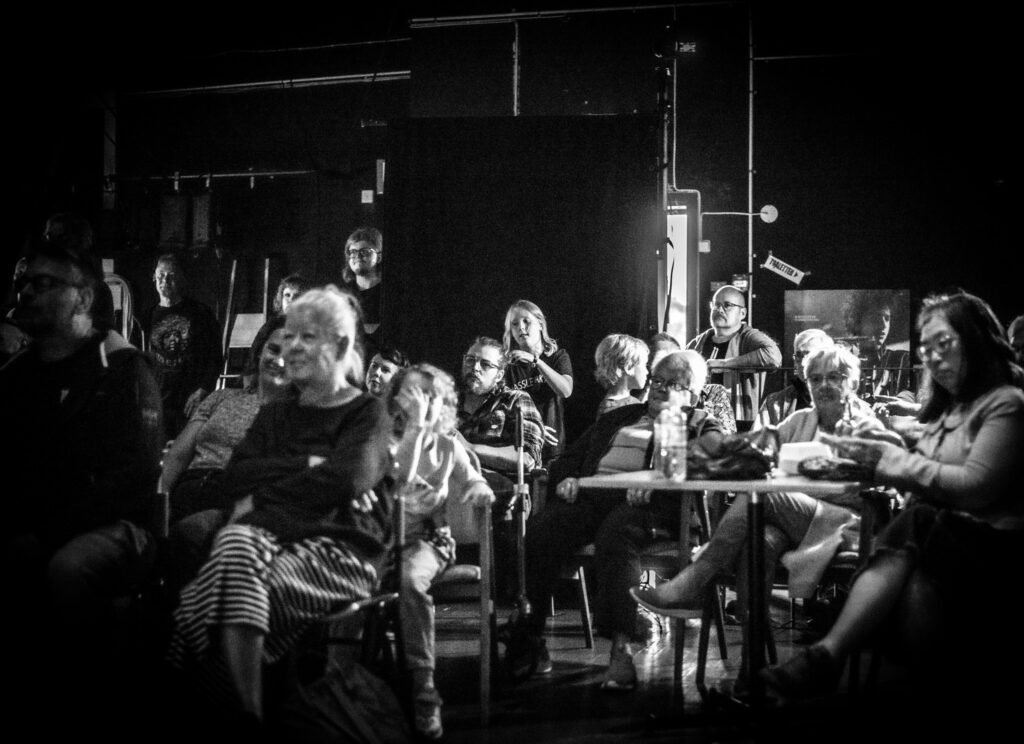 Vi låter ridån vara stängd, och håller våra arrangemang i det stora scenrummet. Artist och publik kommer nära varandra, och den dramatiska scenen med enorm takhöjd och svart parkettgolv blir en stämningsfull lokal med skön backstage-känsla.